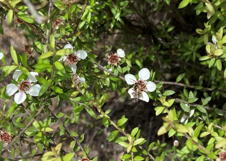 Further round there is another discovery by the washing line. Above a wooden retaining wall, a dry clay bank is overhung with ground creepers. Luke remarks that there are often masses of bees here. We look closely at a couple of small black things that have settled on tiny daisies. One is a fly of sorts – flies are also pollinators! – but the other I think might be a native bee or a mason wasp. I was so excited to spot native bees feeding on manuka flowers on a walk up to the Spinnaker Lookout in late November. They don’t look anything like honeybees and love to drill into the clay banks to make simple nests. They also popped up in Marie and Alan’s garden. * I’ve added a link below to a great blog about our native bees.