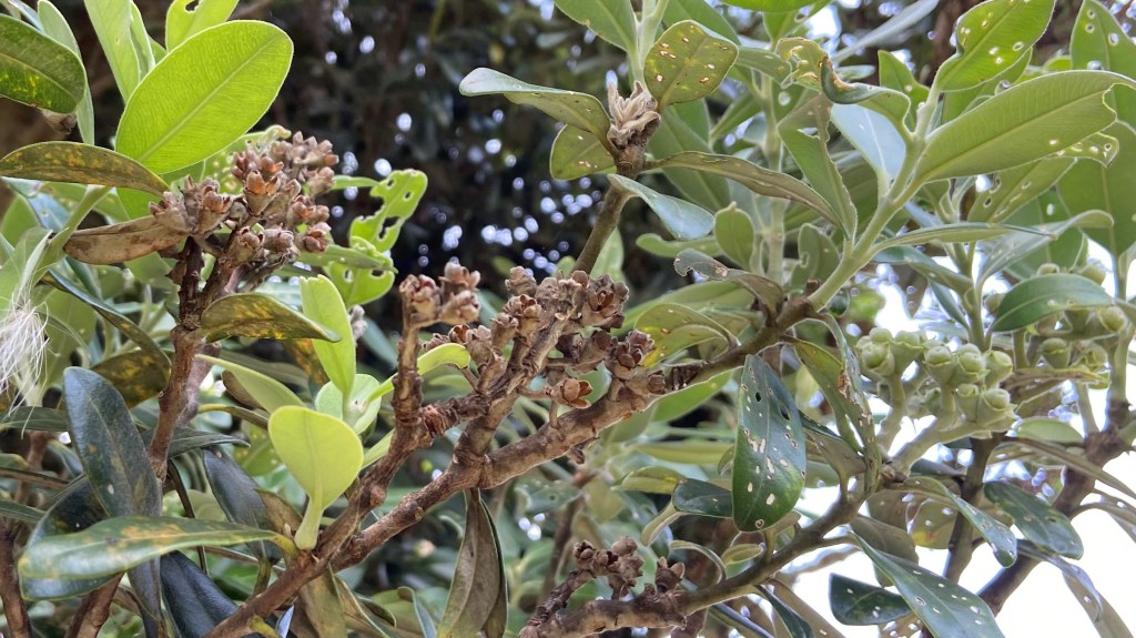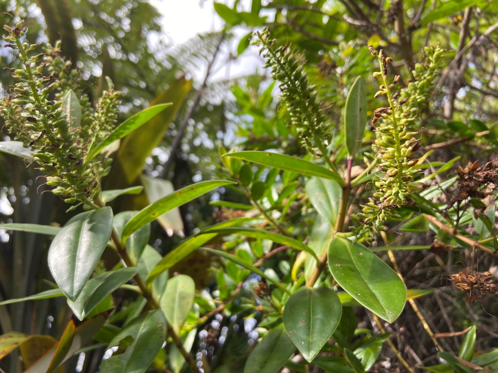 I notice the dried seed pods of pohutukawa, kowhai, wattles and even cow parsley, and the white, purple and red berries of ti kouka, ngaio and karamu.