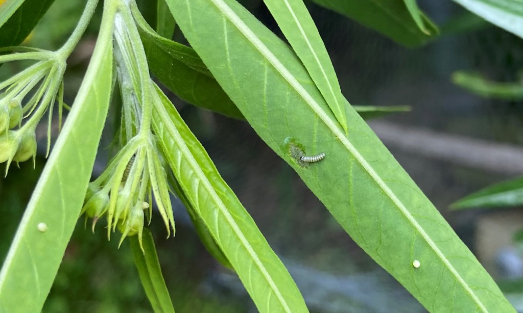 Finally, she gingerly lands for moments on the top of the plant before soaring away. I race down to the garden. There is a tiny pale-yellow egg on the underside of a leaf tip. I notice several other eggs that must have been laid earlier and some miniscule caterpillars, perhaps a day old.
