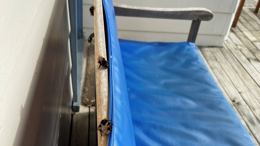 At lunchtime a succession of bumblebees fling themselves into the lee of our north facing deck, landing on blue chairs, bowing their heads into crevices between the canvas and the wood in what looks like exhaustion. They are still for a while just their abdomens pulsating softly. This time of year signals the end of the lifecycle for the old queens, her female workers and the males. Though some might be newly fertilized queens searching for a place to hibernate. I offer honey water to one passed out, clinging to the gate latch. She/he sips hungrily. Maybe not enough nectar flowers around now. Bumblebees are always on the edge of starvation.