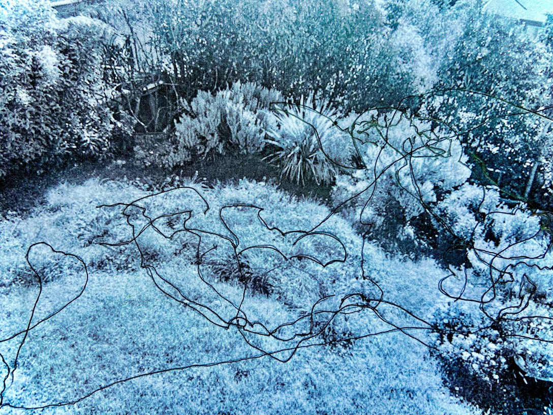 Still stuck at home with the flu, with little energy to much neighbourhood walking, Instead I get curious about the vitality of insects, and attempt to map their kinetic energy and pollinating pathways, during moments of warmth and sun following days of grey skies and rain. For half an hour I make line drawings, trying not to look at the paper, letting my eye and hand follow the paths of bees and flies as they fly in and out of frame, feeding on flowers.