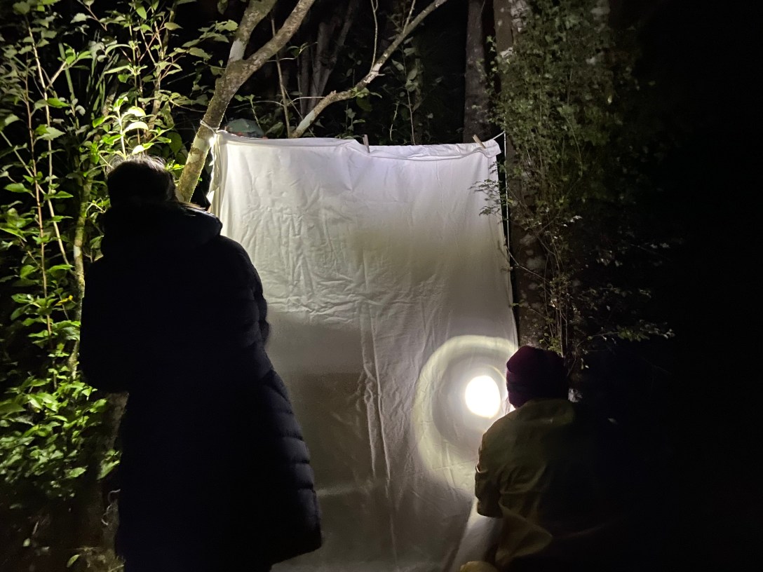 Darkness descended around 8.30pm, our cue to head down to a spot in the bush, just beyond streetlights and glows from home windows. And if anyone was looking from those windows as we walked past they may well have fallen about laughing. Fey had jokingly made us bibs titled moth count supervisor and moth count interns to wear over our rain jackets and over-trousers. And combined with flashing headlights strapped to beanies our rather bizarre looking convoy marched down the road. I really wasn’t sure how this experiment would go.